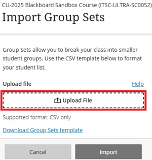 - After you have filled out the .csv file > Save the file > Return to Import Group Sets page. Click Upload File.